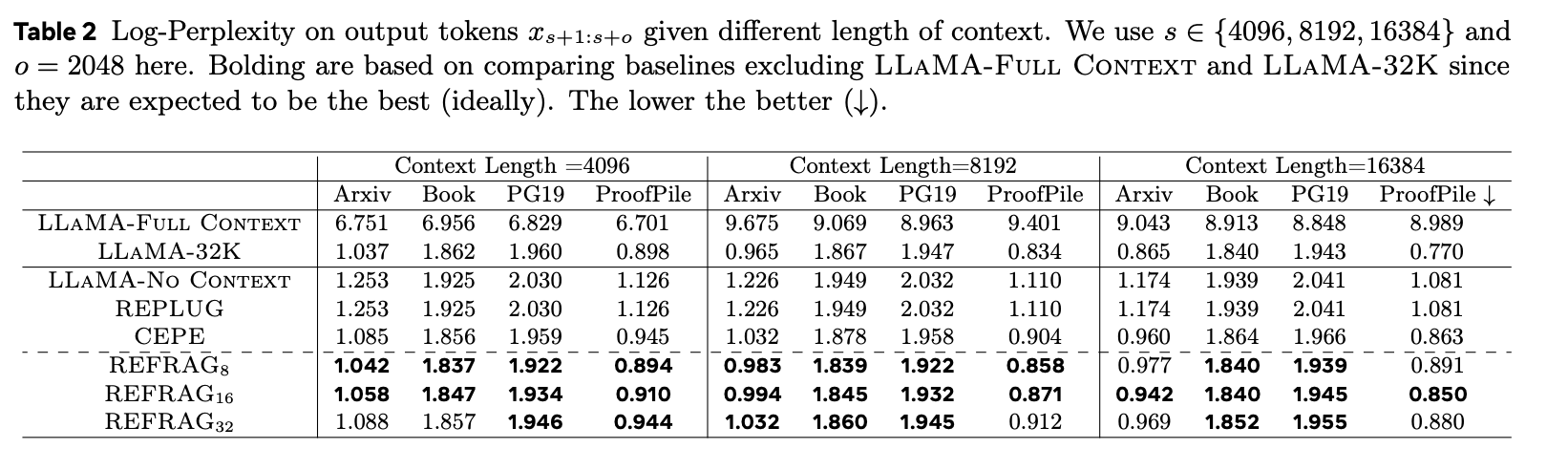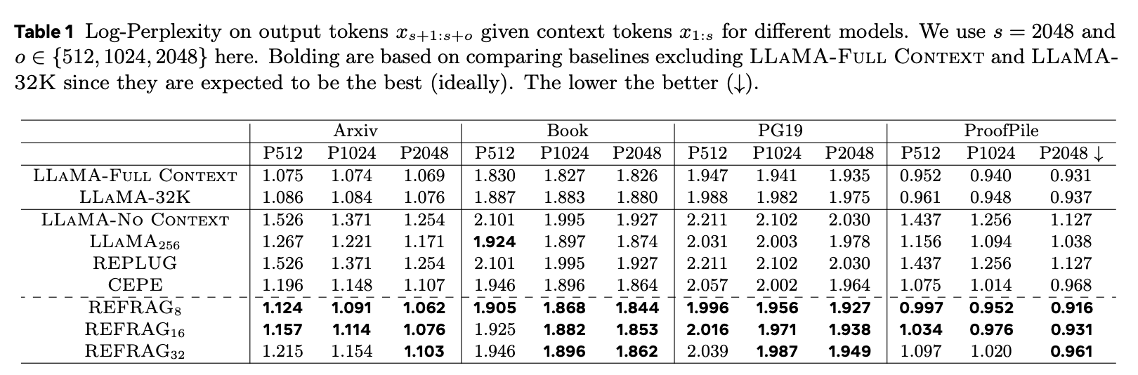 The results show that REFRAG achieves considerably low perplexity, excluding the baselines.