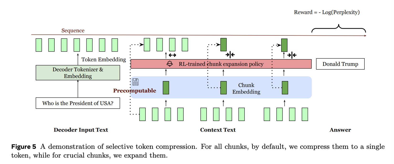 This is a method of selectively decompressing important context chunks to improve prediction accuracy. Using RL (Reinforcement Learning), the model learns which chunks to use as original chunks by setting the perplexity of the next paragraph as a negative reward.